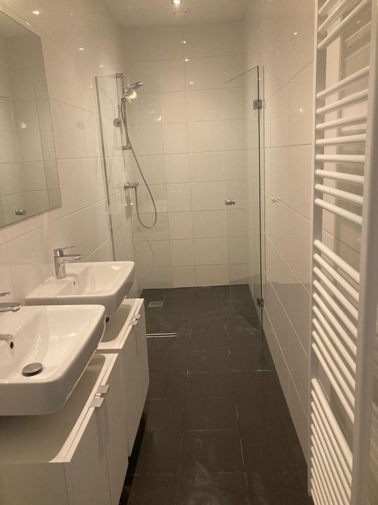 Halfway down the hall you will find the bathroom, equipped with a double sink, the shower room with beautiful glass doors and a design radiator.