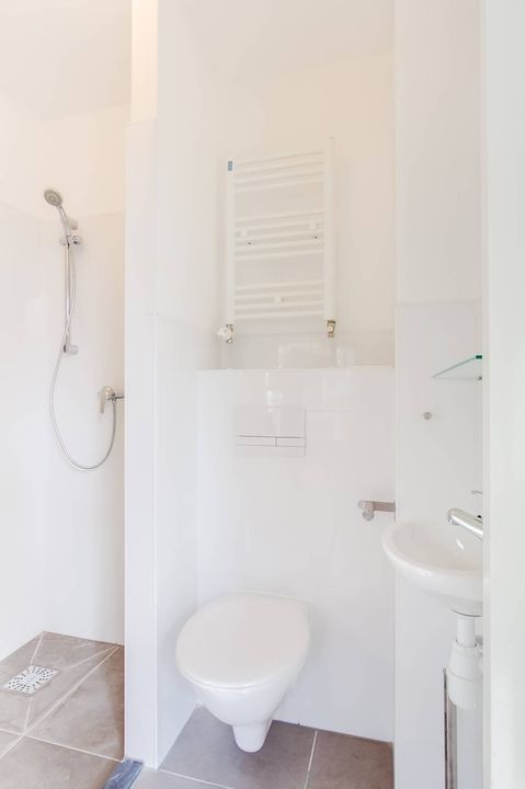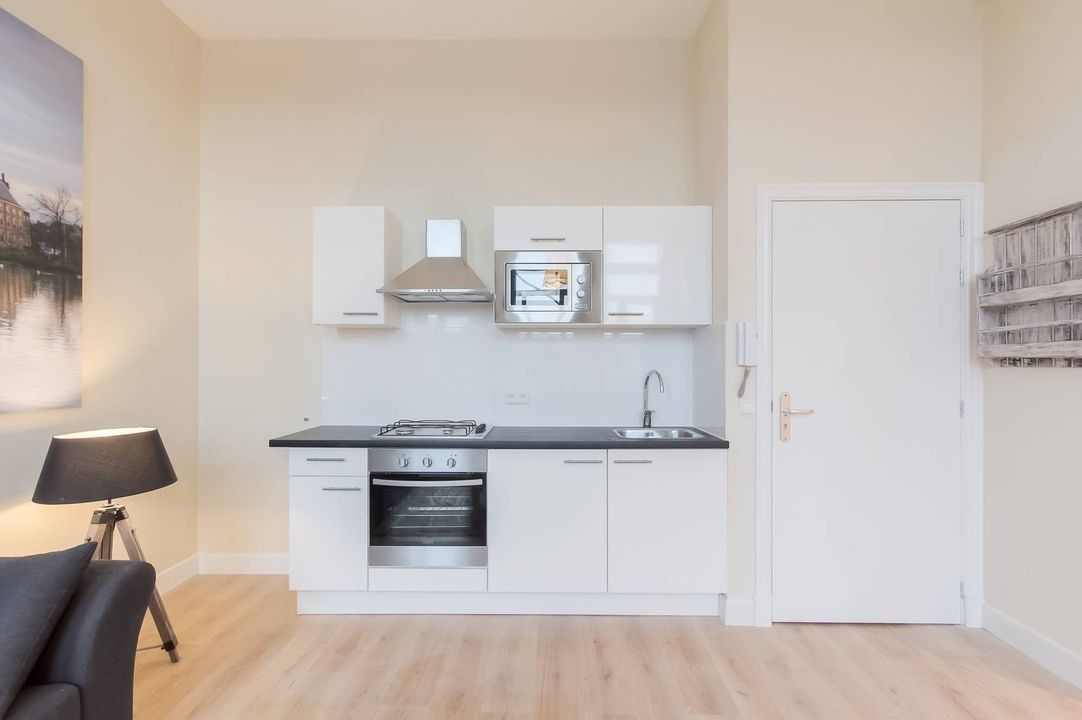 The studio is located on the first floor on the backside. It has an open kitchen, a lovely sitting area and a seperate bedroom. Also the studio is equipped with a separate bathroom with shower, washbasin and toilet. There is a washer/dryer area available in the common area.Gas, water and electricity is included in the rental price.