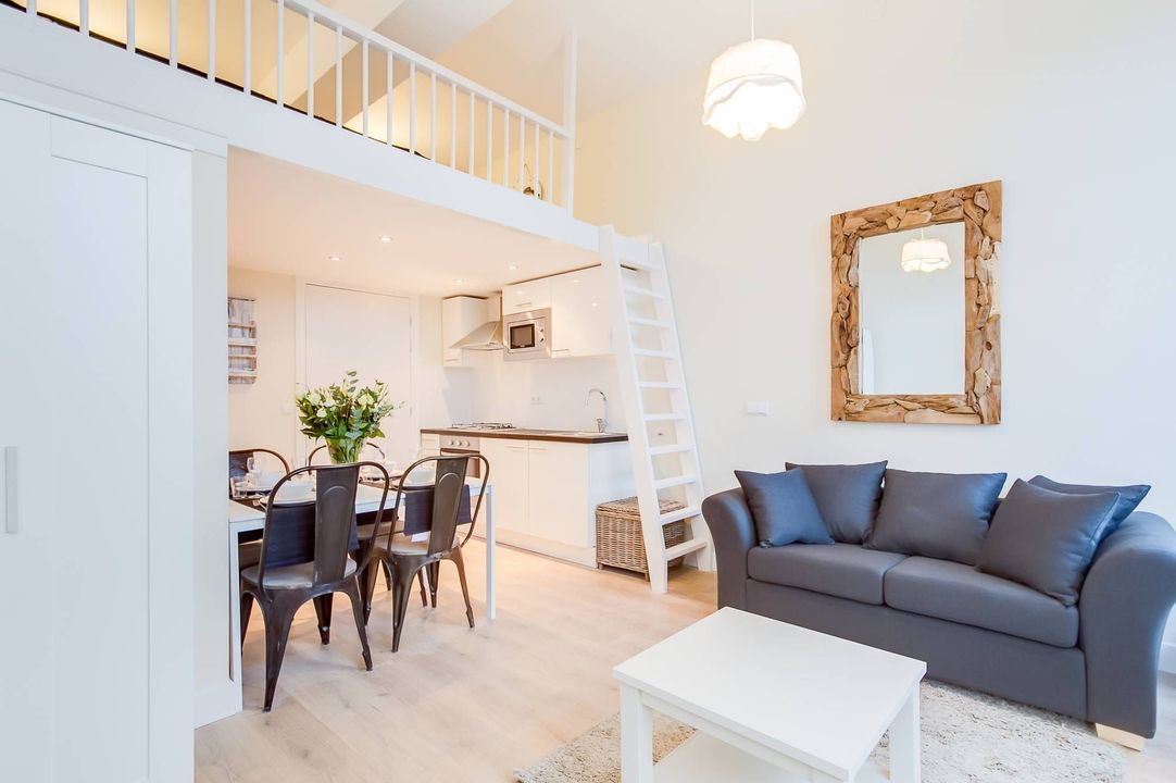 The studio is located on the second floor. It has an open kitchen, a lovely sitting area and a comfortable loft-space. Also, the apartment has a separate bathroom with shower, sink and toilet. No separate bedroom but a loft space. The common laundry room is located in the hallway.