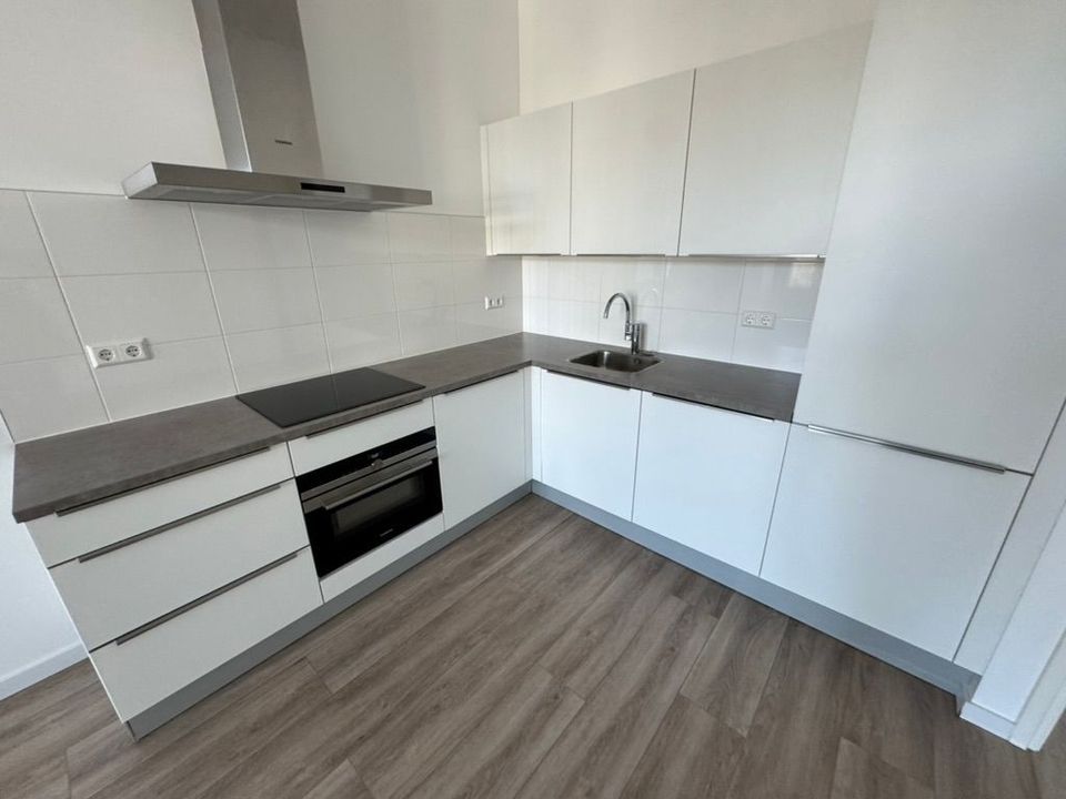 Lichte royale woonkamer aan de voorzijde met open keuken met inbouwapparatuur zoals een vaatwasser, combi-oven, koel-/ vriescombinatie en inductiekookplaat.